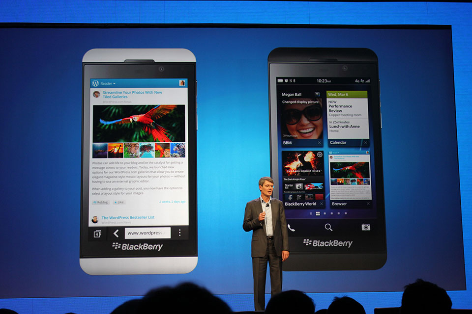 It’ll arrive in the U.S. in March, with pre-orders starting at the four major carriers, including Verizon, AT&T, Sprint and T-Mobile today, according to BlackBerry’s Alec Saunders. Pricing in the U.S. has yet to be announced for all carriers, but Verizon has said it will provide the Z10 at $199 on a two-year term for new agreements. And while on stage BlackBerry said that the Z10 will come to the U.K. tomorrow, on through all major UK channels, including EE, Phones4u, CPW, Vodafone, O2, Three UK, and BT.