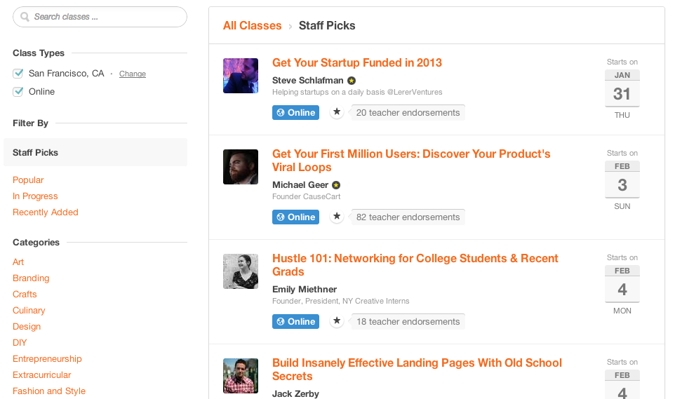 As to how it works: Teachers spend time designing the class and the projects that students will complete, with a syllabus that includes a combination of curated learning materials, online lectures and live, interactive office hours. Students can then engage in discussions, share and submit their class projects and get feedback on their work from teachers and classmates. Classes typically range from one to four weeks.