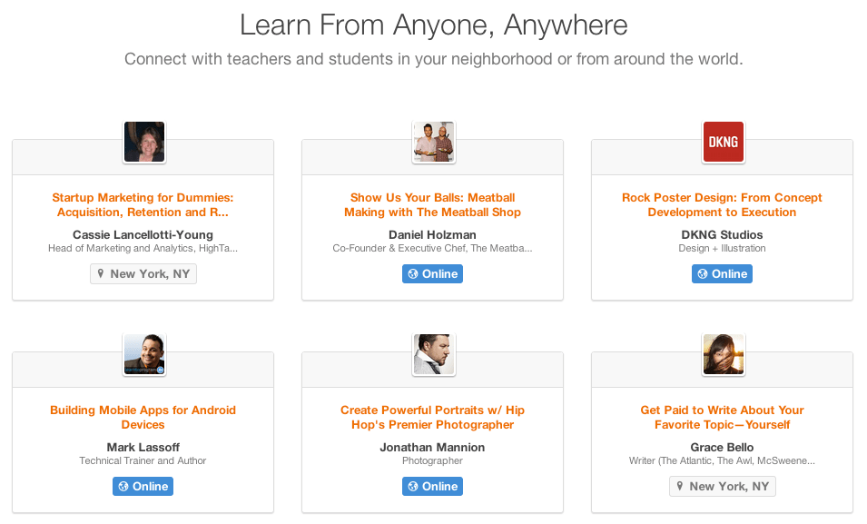At launch, however, Skillshare limited users to participating in classes that took place in their local area, but last year, the startup added hybrid, online classes to its platform, allowing teachers to create classes that are available globally and enable students to take live, interactive classes — on the Interwebs. Since then, the startup’s growth has accelerated, with the size of its classes growing from an average of 20 to 30 students to thousands, and teachers are now earning upwards of $30K per class.