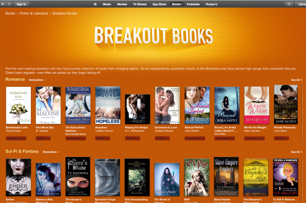 Apple has collected a selection of self-published titles on the iBookstore under a new “Breakout Books” section. The section is intended to give special attention to “emerging talents,” according to Apple, and each is both independently published and highly rated by users. Some are free, most are cheap, and the effort looks like an attempt to remind users that just like Amazon, Apple’s digital bookstore is an opportunity for independent authors to find an audience.