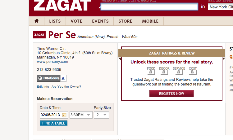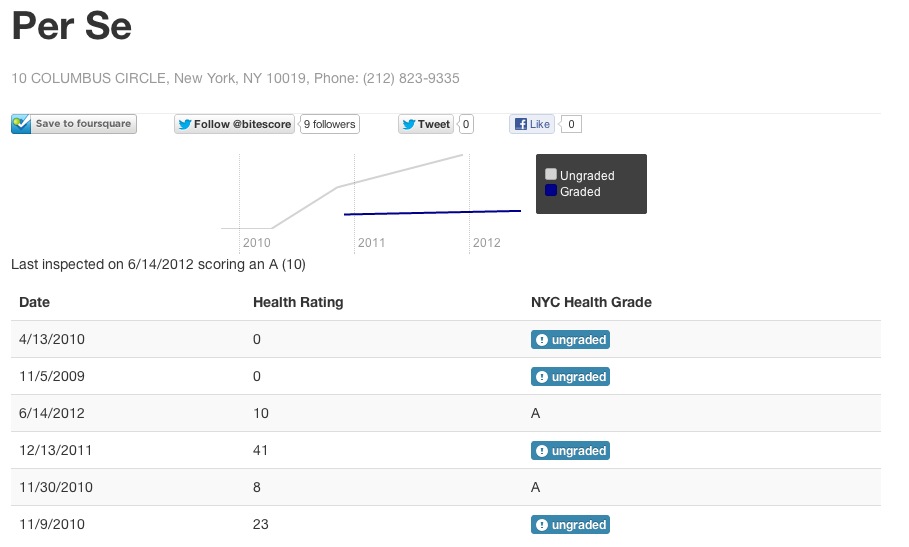 BiteScore also builds a fairly staid results page that exposes the change in health violations over time. For example, Per Se scores an “A” rating while other, lesser restaurants limp along with a “B”.