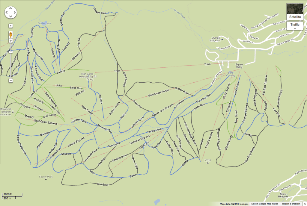 Ski runs are marked on Google maps with the usual blue, green and black lines to mark the difficulty of the terrain. Ski lifts are marked as red dotted lines.