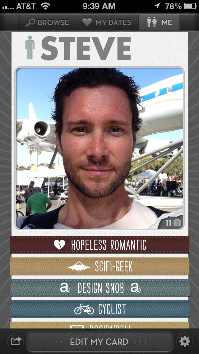 Once you’re set up, you can start browsing other cards and suggest “Let’s Date” or say “No Thanks.” If you say “No Thanks,” you highlight the areas of the card that don’t interest you, and the app gets better about recommending potential matches. If you say that you want to date someone, you’re moved somewhere near the top of their pile, and if they have the same response to you, then the two of you are connected.