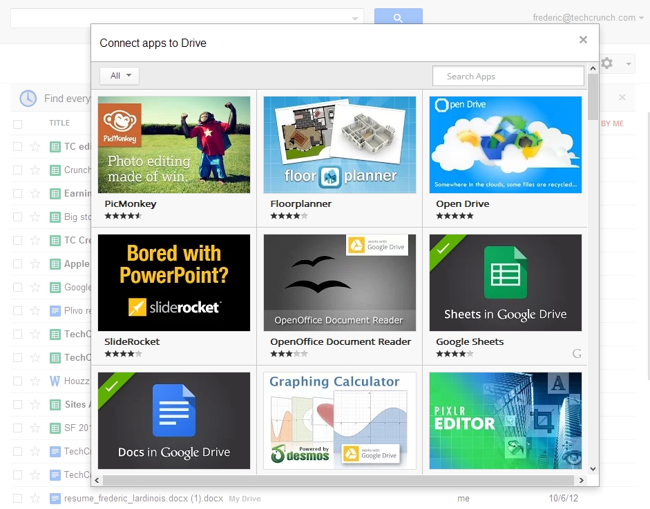 Google just added the equivalent of an app store to Google Drive that lets you find Drive-enabled third-party apps like HelloFax, SlideRocket and the Open Office Document Reader right from within the service. Once installed, these apps now also live right in the Google Drive ‘Create’ menu. Until now, users had to go through the Chrome Web Store to find Drive-enabled third-party apps.