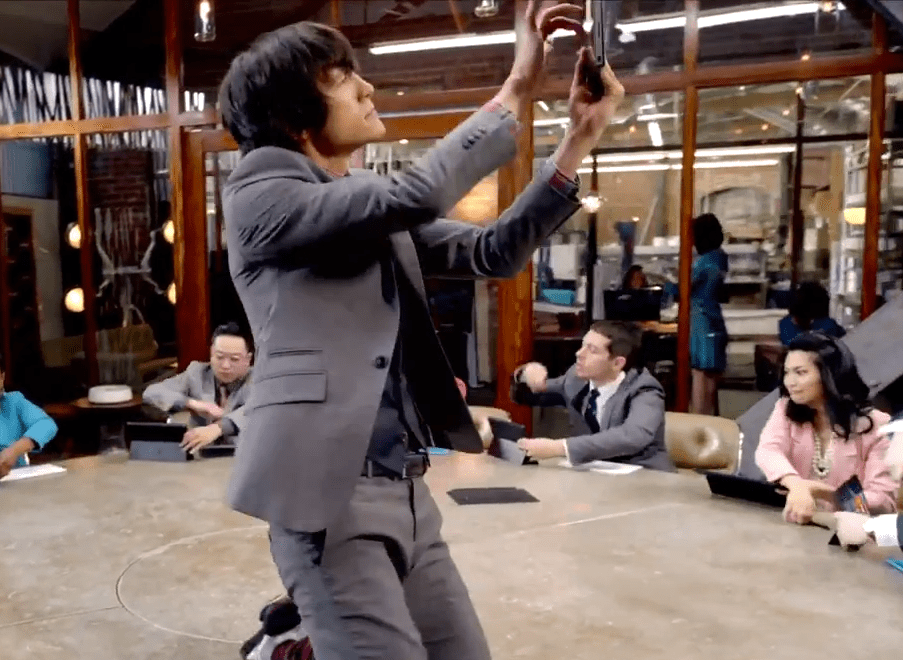 Oh, but the main character is now dancing on his knees in the middle of the table, Surface Pro in hand. But wait, two new characters enter the conference room! It’s the sourpuss boss. What in tarnation? Are his employees insane? No, man, he’s here to drop the break. More dancing, more drawing on an Excel spreadsheet.