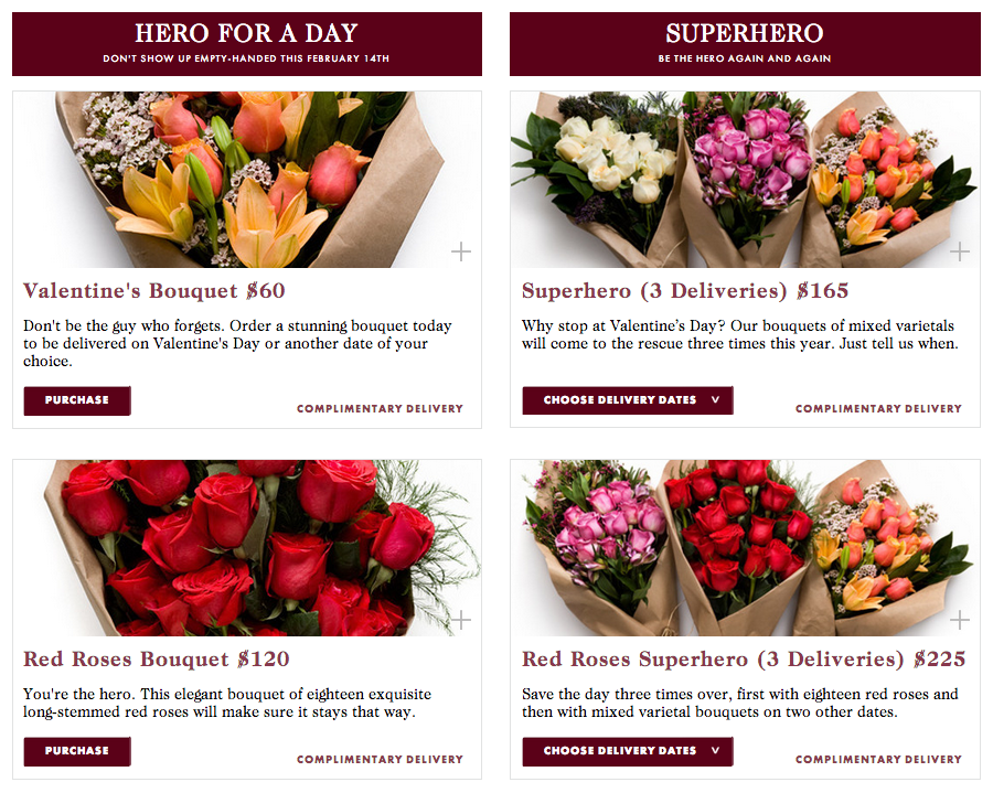The Hero package will get you one bouquet on Valentine’s Day — either a $60 assorted bouquet or an $120 assortment of 18 long-stem red roses. But if you’re looking for something more, you can sign up for the longer-lasting Super Hero package.