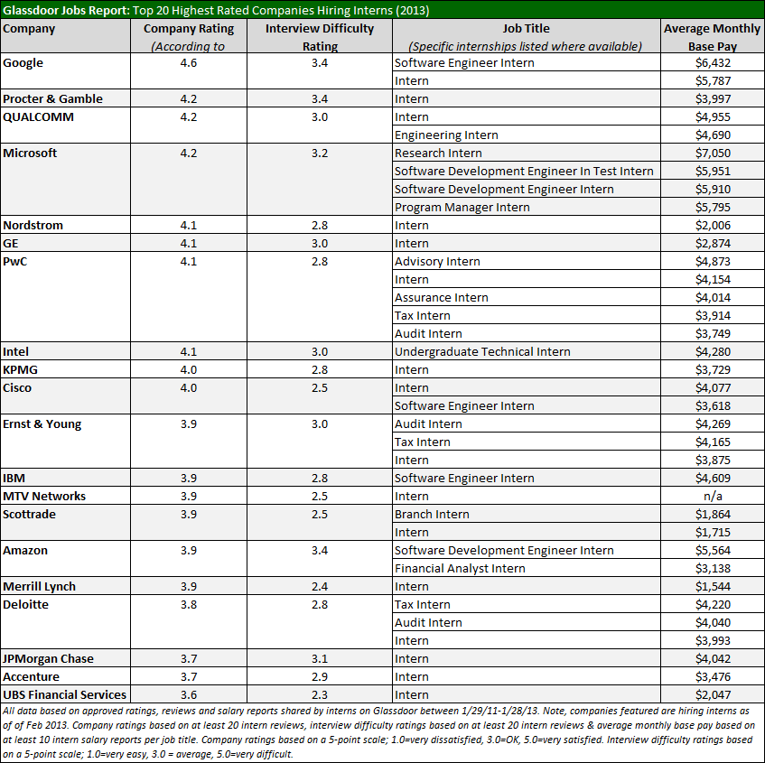 The report reveals that 63 percent of paid interns received “at least one job offer upon graduation” in 2012, compared to the 36 percent of grads who had no internship experience. In turn, 75 percent of employees that were hired out of internships were retained after a year, compared to 60 percent for those who didn’t. So, with students now beginning to prepare and apply for summer internship opportunities, online jobs and career community, Glassdoor, has taken a look at the companies that are rated highest among those whose opinion counts the most: Current and former interns.