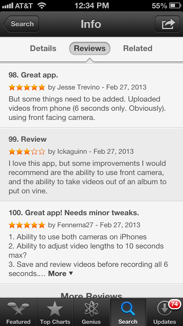 This seems obvious, but I’ll say it anyway: Vine needs a front-facing camera option. I’m not the only one who feels this way — this seems to be the most popular request in Vine’s iTunes reviews section. And it makes sense.