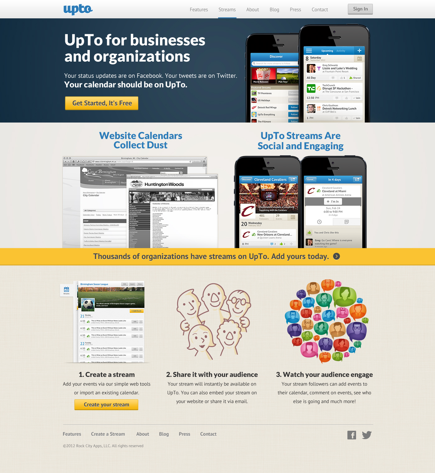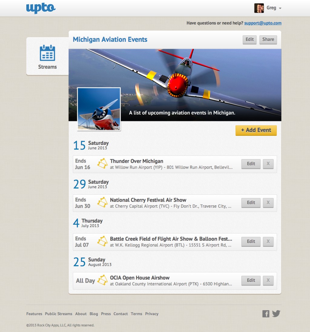 For example, those organizations attending SXSW can create an UpTo stream of the events they’ll be attending, which users can follow to help plan their own schedules, see which parties their friends and co-workers will be attending and so on.