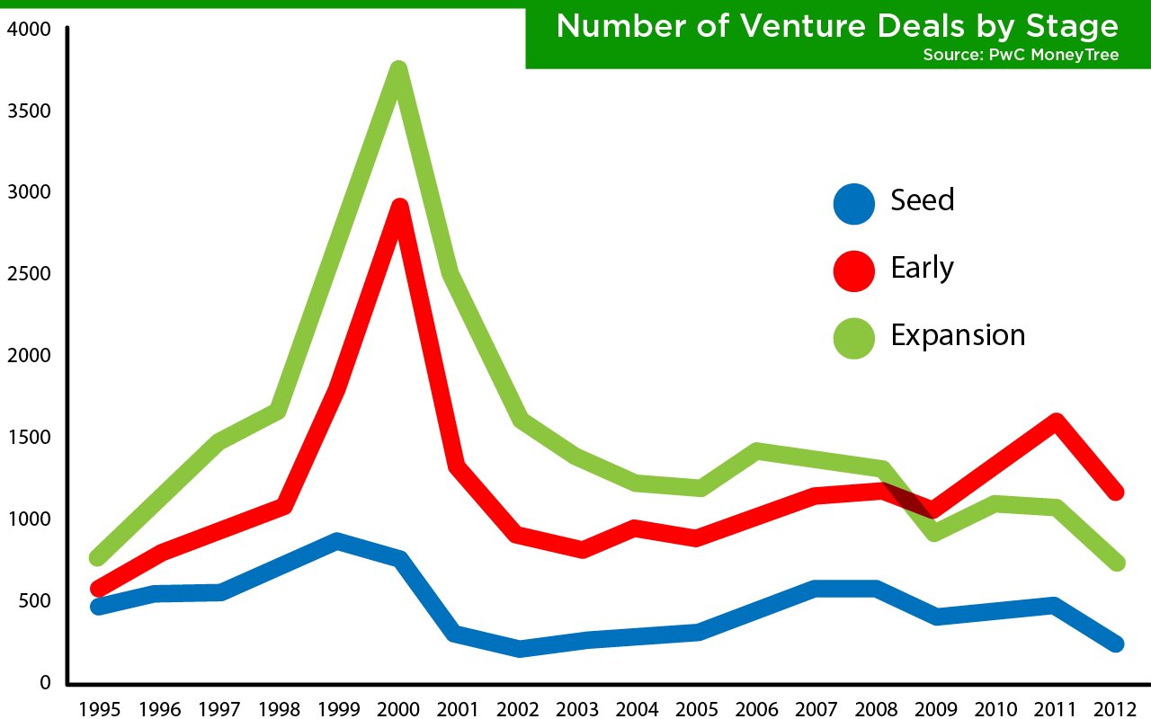 According to PwC MoneyTree, the rate of seed investments made by venture funds (including both seed and traditional early-stage funds, but not including angel investors) has actually remained relatively consistent over the past 10+ years.