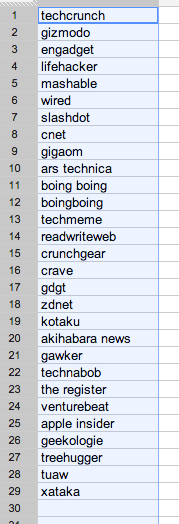 I’ve dragged the cells down to 200 lines and it doesn’t seem to ever stop. Here’s another neat one, found by our own Chris Velazco: Drop TechCrunch into the top cell, and drag it down holding the Option key to see other tech blogs: