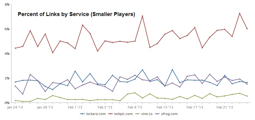 As you can see in the chart above, native Twitter photo hosting (pic.twitter.com) is the dominant player, followed by Instagram and then a number of less prominent competitors. When you remove Twitter and Instagram, you can see just how small a player Vine is when it comes to sharing media.