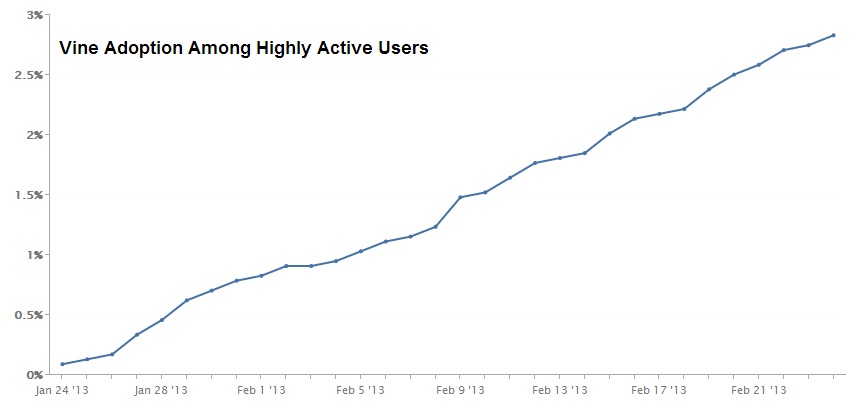 Vine showed impressively stable adoption growth over the course of its first month. We were expecting to see a spike in adoption around the time of the announcement followed by a leveling-off period, but instead the percentage of new users each day has remained consistent. This is a good sign for future growth, because the rate of adoption does not appear to be slowing as time goes by.
