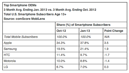 Apple’s iPhone made up some ground in the most recent comScore smartphone OEM market share numbers, covering the three-month period ending in January 2013. Apple’s share rose from 34.3 percent curing the previous quarter to 37.8 percent, a point change of 3.5. Samsung’s share also rose, going from 19.5 percent to 21.4 percent, growth of 1.9 percentage points. HTC and Motorola shed share, maintaining their third and fourth-place spots but each losing nearly as much share Samsung gained.