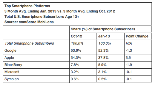 ComScore also measured smartphone platform share, and found that Google’s Android accounted for 52.3 percent of overall U.S. smartphone subscribers aged 13 or older, a drop of 1.3 percentage points vs. the previous quarter. Apple’s iOS gained ground, adding 3.5 percentage points to its share, going from 34.3 percent share in the quarter ending October 2012, to 37.8 percent in the one that just ended in January.