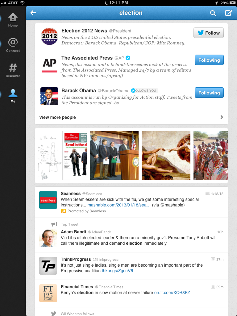 The only old tweet I saw with the “election” search was a promoted one. Hopefully that won’t be the case for all of your searches. As the discovery experience gets better, Twitter can hopefully trap those non-tweeters into clicking more links and following more people.