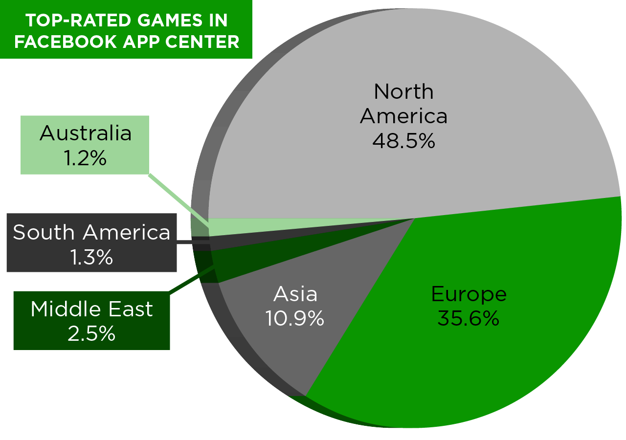 Geographical distribution. The geographical distribution of the studios that have developed top-rated games in the Facebook App Center is as follows: North American (48.5%); European studios (35.6%); Asian studio (10.9%); Middle Eastern studios (2.5%); South American studios (1.3%); Australian studios (1.2%).