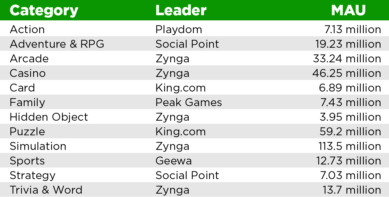 Almost half of the categories are dominated by Zynga, while the rest are led by King.com (2), Social Point (2), Geewa (1), Peak Games (1) and Playdom (1). Though Wooga and EA do not show up as category leaders, they nevertheless have a sizable presence in these genres. Other usual suspects also figure high in these lists, except perhaps for 6waves, which seems to have shrunk by more than three times its MAU on Facebook within the last year.