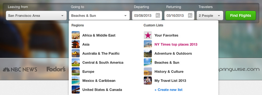 That is where this aforementioned element of choice (or lack thereof) comes into the picture. Here’s how it works: Users sign on to GetGoing via the usual process or through Facebook (I recommend the latter), at which point you can search for routes to over 1,000 destinations in 50 countries (and growing). The service allows you to select from particular regions (like “Africa & Middle East” or “Mexico & Caribbean”) and custom lists and categories (like “Adventure & Outdoor” or “Beaches & Sun”), or you can create your own.