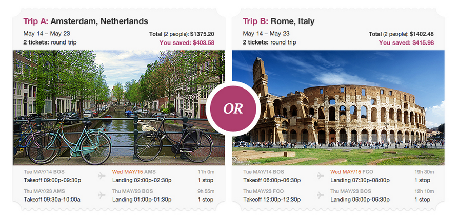 The idea, of course, is to get you tickets at prices that are significantly discounted. For example, I chose two tickets to Nassau (Bahamas) for $825 and San Juan (Puerto Rico) for $555, which GetGoing says saved me $250 and $195, respectively. The cheapest comparable ticket I could find via U.S. Airways (with 1 stop) was about $980. Definitely favorable in comparison, though not quite as much as GetGoing advertised. The startup claims to be able to get 20 to 40 percent discounts on its tickets on average, and to its credit, follow up searches all yielded discounts in that range.