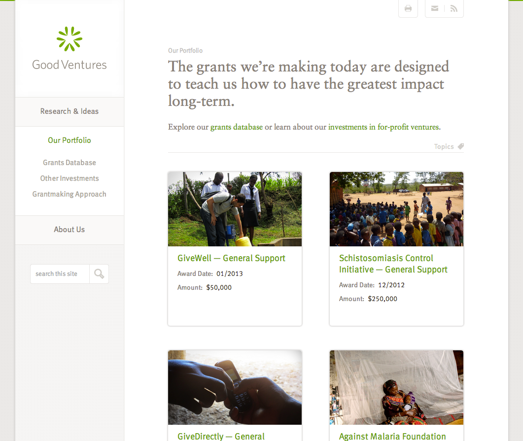 Its “portfolio” reads like a list of every difficult problem felt in third-world countries, and it’s expansive already. Just some of the issues that Good Ventures has issued grants for are curing and treating malaria, marriage equality, and small enterprise support. The grants seem to average $50,000 and are going directly to the causes that need it the most.