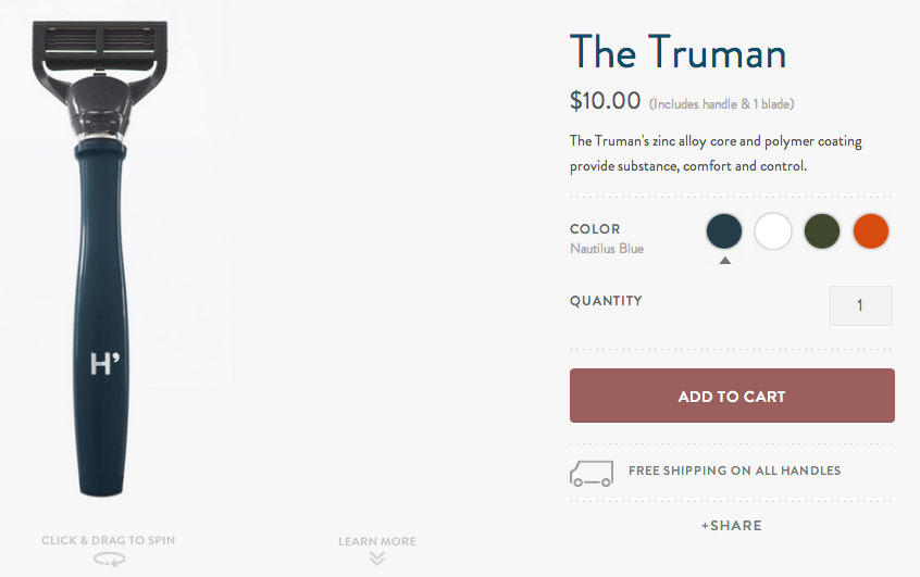 Harry’s is also using the Warby Parker branding playbook by giving its razors familiar, “people” names; yet, instead of “Chandler” or “Beckett,” Harry’s razors have names like “Winston” and “Truman.” The idea is to give them that boutique, classic feel so that you, the average consumer, believe you’re getting quality without paying an armload. To that point, the company then sells its razors individually (at $10 and $20, respectively) or in sets that come with three blades and shaving cream for $15 and $25.