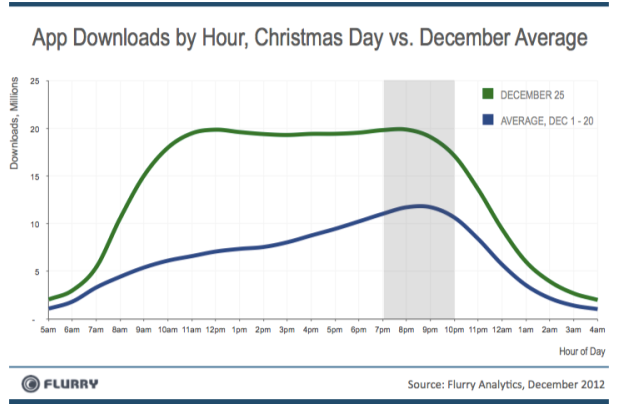 One of the masters of this in the startup technology world is Flurry. Consider this blog post titled, “Christmas 2012 Shatters More Smart Device and App Download Records.” In the post they list four charts with data showing how Christmas day is a huge driver of downloads for mobile applications (obviously because many people get new smartphones for the first time). It’s why every major mobile app developer gears up for the holiday season by trying to be as high as possible on the charts because when the newbies come searching for popular apps in the app stores you get a huge additional bump if you’re already high in the charts.