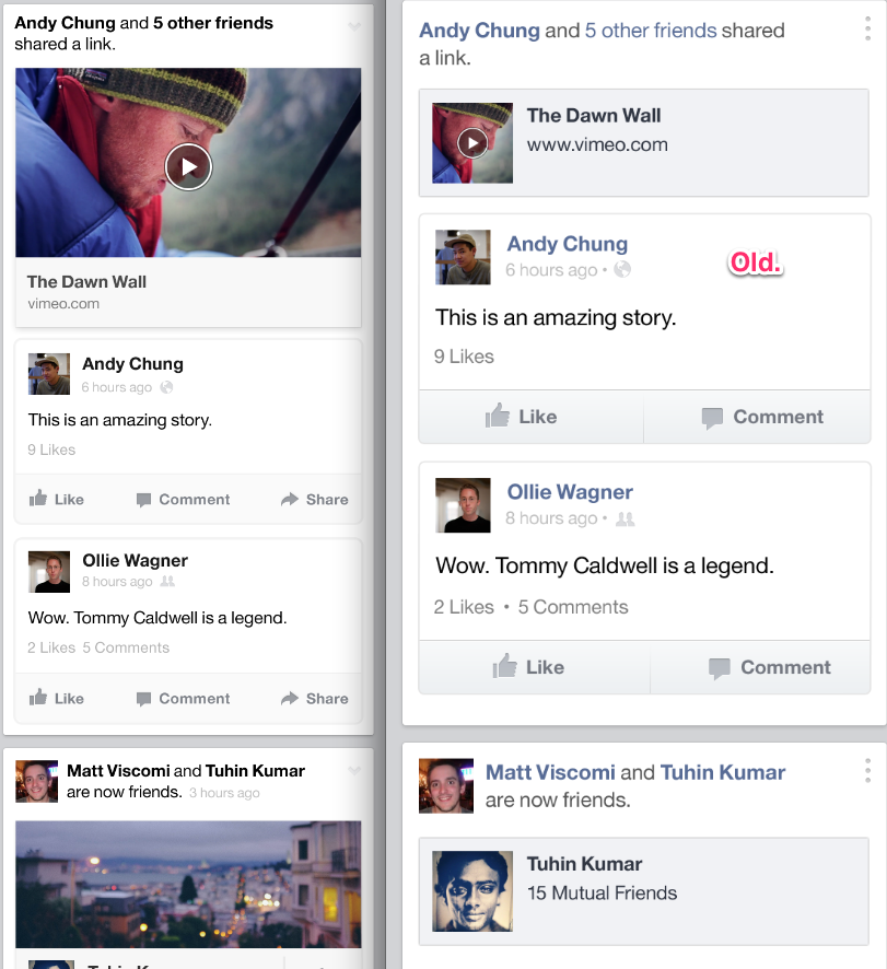One of the interesting parts of doing this project is that we have so many stories and links and friend stories, and News Feed is a very complex thing and we tried to design it in a way that honors each type of content. We went through all of the different stories and Chris Cox would say “how would we handle this type of story”. We didn’t know. This let us go back to the drawing board and look at things differently.