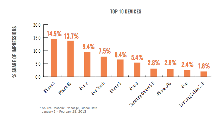Apple’s iPhone and iPod devices ruled overall with a 38.1 percent share of Velti ad impressions, with the various iPad models making up 17.2 percent. By comparison, all Galaxy devices together only managed less than 5 percent of ad traffic in February. iOS ads were also better performing in terms of effective cost per thousand (ePCM), garnering 20 percent more than their Android counterparts. That’s in spite of a higher click through rate on Android: ads on Google’s mobile platform earned around 50 percent more clicks than those on Apple’s.