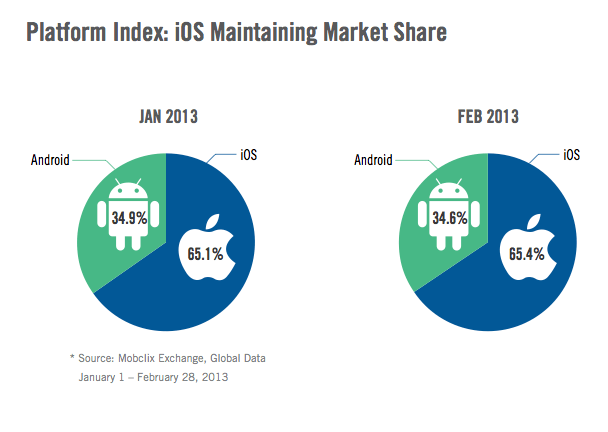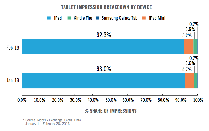 Taking tablets on their own, there isn’t even remotely any competition for iOS. Android tablets as a whole account for only 0.7 percent, according to Velti, with the iPad making up 97.5 percent, with its share mostly shifting from standard iPads to iPad minis between January and February of 2013.