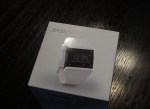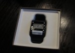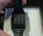 The device itself is about one inch on each side with an integrated rubber band. Four spots in the corners activate various features and there’s a central button that is not yet activated in this incarnation of the device. Pressing the right buttons displays steps take, calories, and current heart rate and you can activate the clock or data by pressing the left “buttons.” A sensor turns on the backlight when you move the watch towards your face (this happens intermittently but it works in principle) and you can also turn on the backlight by pressing the left touch button.