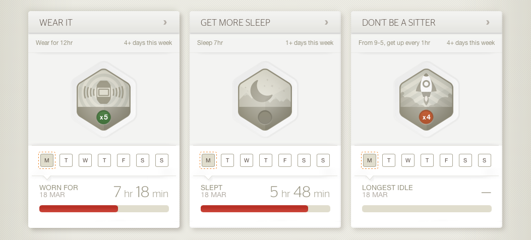 This system is both ingenious and frustrating. While open-ended health devices like Fitbit and the Jawbone Up reward you after you’ve completed a certain number of steps with an email or notification, the Basis forces you through a set of gamified steps to gain your “reward.” It encourages you to visit the website often and unlock new rewards but the rewards themselves are so open-ended that it’s difficult to remember some of them. Unfortunately, the Basis band won’t remind you and the only indication that you’ve hit a certain step count is a little winner’s cup icon at the end of the readout. A bit more info – “You completed the Sleep For Eight Hours Challenge” – would be immensely helpful.