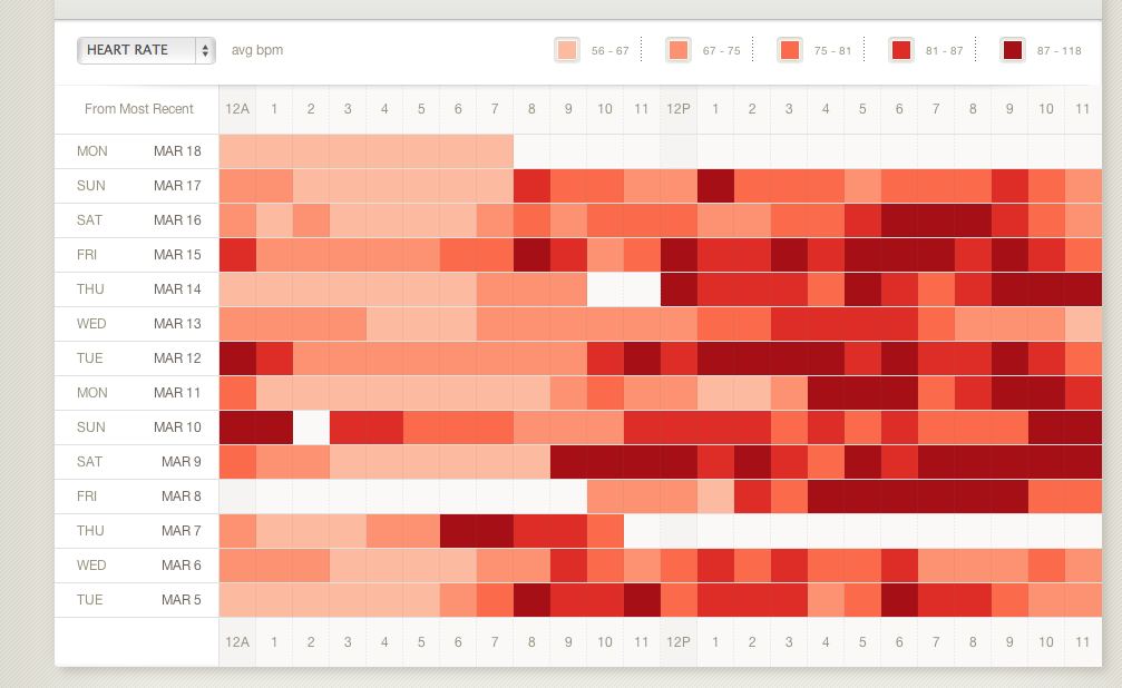The system also offers a number of interesting graphs including comparative activity and “heat graphs” of your various vital statistics. You can, for example, see when you tend to sweat the most (I found sweat when I eat) and when you tend to wake up. “Insights” offer little snippets of information about your day including sleep quality and the like.