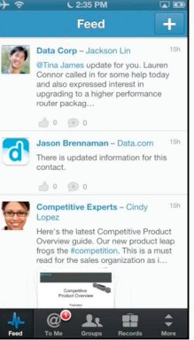 According to Michael Peachey, senior director of solutions marketing at Salesforce.com, a sales person can access and update the account, provide collateral such as data sheets and then use the publishing feature to close the sale. Publisher puts the business actions directly in the feed. A sales person can see leads, opportunities, cases and eventually custom apps developed in the Salesforce.com AppExchange. In addition, a sales person can create groups or assign tasks.