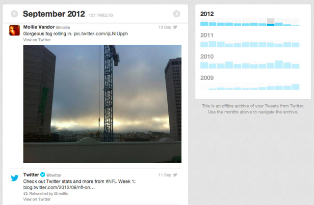 Today, we’re introducing the ability to download your Twitter archive, so you’ll get all your Tweets (including Retweets) going back to the beginning. Once you have your Twitter archive, you can view your Tweets by month, or search your archive to find Tweets with certain words, phrases, hashtags or @usernames. You can even engage with your old Tweets just as you would with current ones.