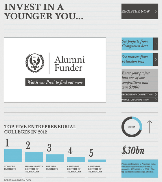 Next up, AlumniFunder will look to continue pushing its contests onto more campuses to help spread the word, beginning on April 9th at U.C. Berkeley, Stanford on April 18th and USC at the end of April, with more schools to be added in the near future.