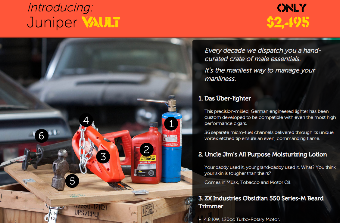 Today, it’s releasing a limited time “Man Pack” that has all that many stuff that you need to be a man. No, not Old Spice, but industrial-grade lighters, motor oil, beard trimmers and presumably other stuff to cut, maul or stab things. Find it here.