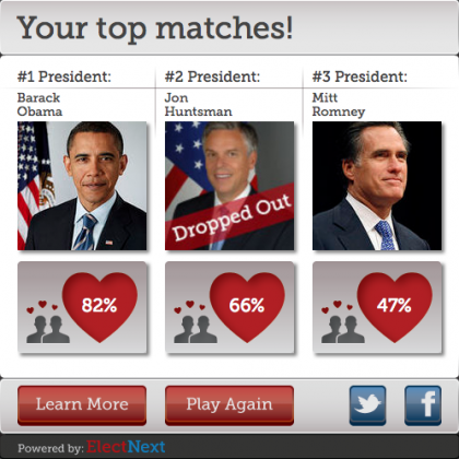ElectNext was a great resource during the last Presidential election, providing a wizard to match your political preferences to the right candidate. Matching up news articles with actual facts and historical data provides a really immersive experience for readers, who can then dig through the data to form their own opinions.