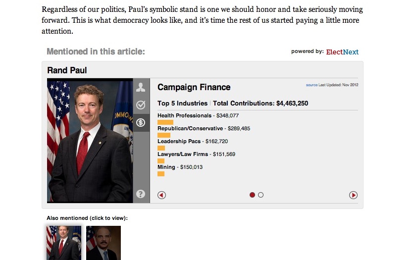 ElectNext is looking to shift the paradigm and similarly harness the power of big data to empower citizens with relevant information on our politicians delivered in the precise moment we most need it. So what we do is consolidate several previously disparate databases, though in our case it is political data on them: campaign finance records, legislation, roll call votes, press releases/debates/other public speech, and we use that data to create simple profiles that describe who these guys and gals running our country really are. We know how they talk about issues vs. on what they actually spend their time legislating and how that compares to their sources of funding. And, best of all, we put those profiles directly in your news, do you can access it in the precise moment you’re already reading about a political person, or issue, you care about, when you need it most.