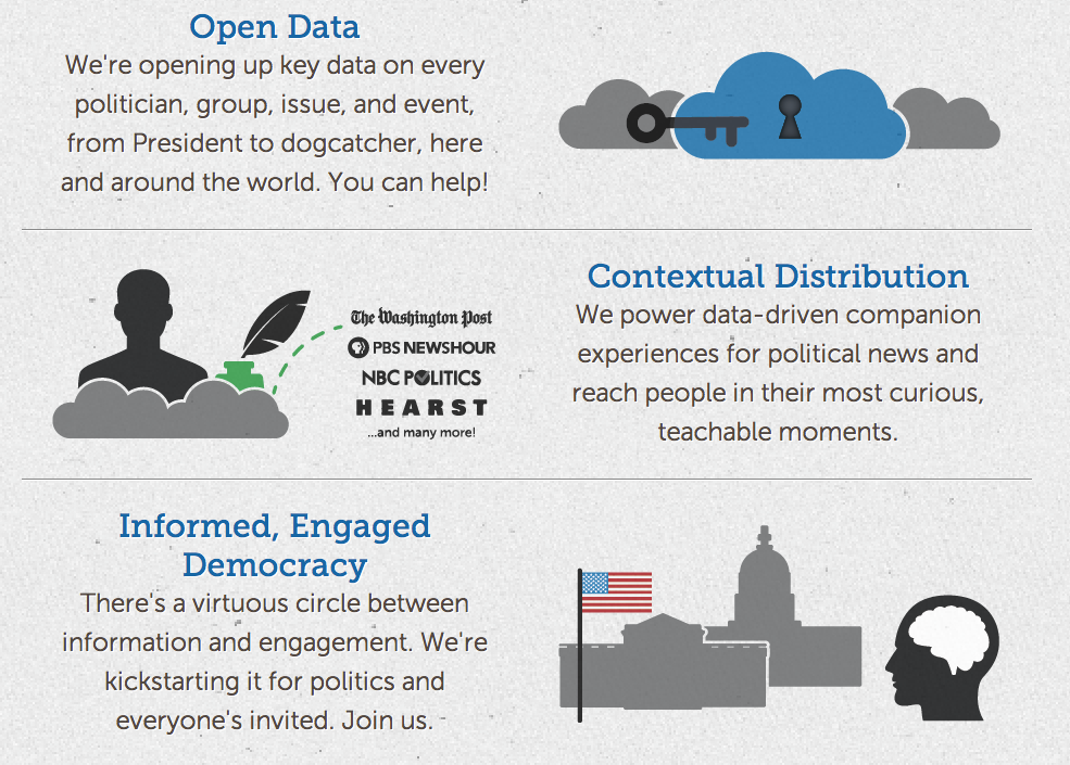When I spoke with ElectNext’s founder and CEO, Keya Dannenbaum, she explained ElectNext as something similar to our own CrunchBase, providing widgets full of data for publications to embed: “We have a comprehensive underlying database (on politicians on our case as opposed to companies in the CrunchBase analogy) from which we create data-driven content that lives inside, and gives relevant context to, political news.”