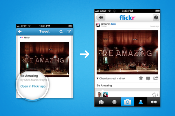 If a user does have the application installed, you can specify a deep-link into the correlated resource within your own application. When a user clicks on the “Open in app” tap target, Twitter will send that user out into your application. This value is specified in the “twitter:app:name:(iphone|ipad|googleplay)” tags. The app url should be your app-specific URL Scheme (requires registration within your app) that launches your app on the appropriate client.