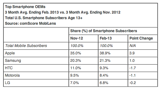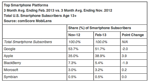 Apple’s trajectory in the U.S. smartphone market over the past little while has been an upwards one, with the company gaining more and more iPhone subscribers every month. During the three-month period covering November 2012 to February 2013, Apple added 8.9 million new iPhone subscribers according to comScore, while Android as a platform in total added only 2.9 million. That means Apple’s share of the total smartphone subscriber base in the U.S. grew to 38.9 percent from 35 percent, while Android’s dropped from 53.7 to 51.7 percent.