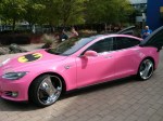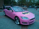 Google co-founder Sergey Brin appears to have been pranked by Google employees, according to info shared on the Tesla Motors Club forum. This image of the Google bigwig’s fancy Tesla Model S roadster, with some aftermarket additions, popped up today on Twitter. Note the sweet “Chrome” rims it’s rolling on, if you can pull your eyes away from the hot pink color scheme, long beautiful eyelashes and Batman iconography.