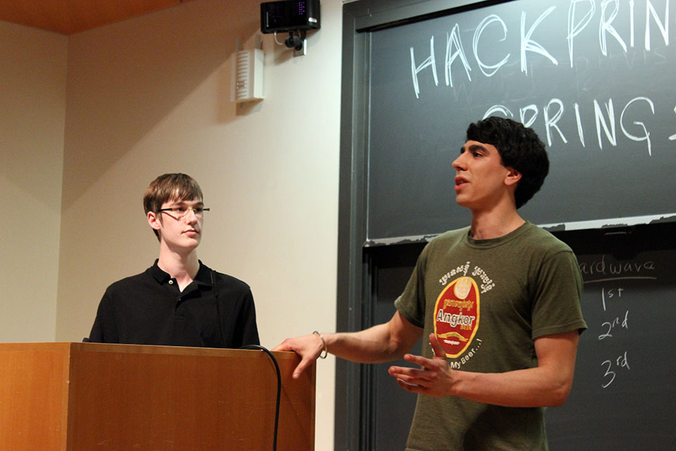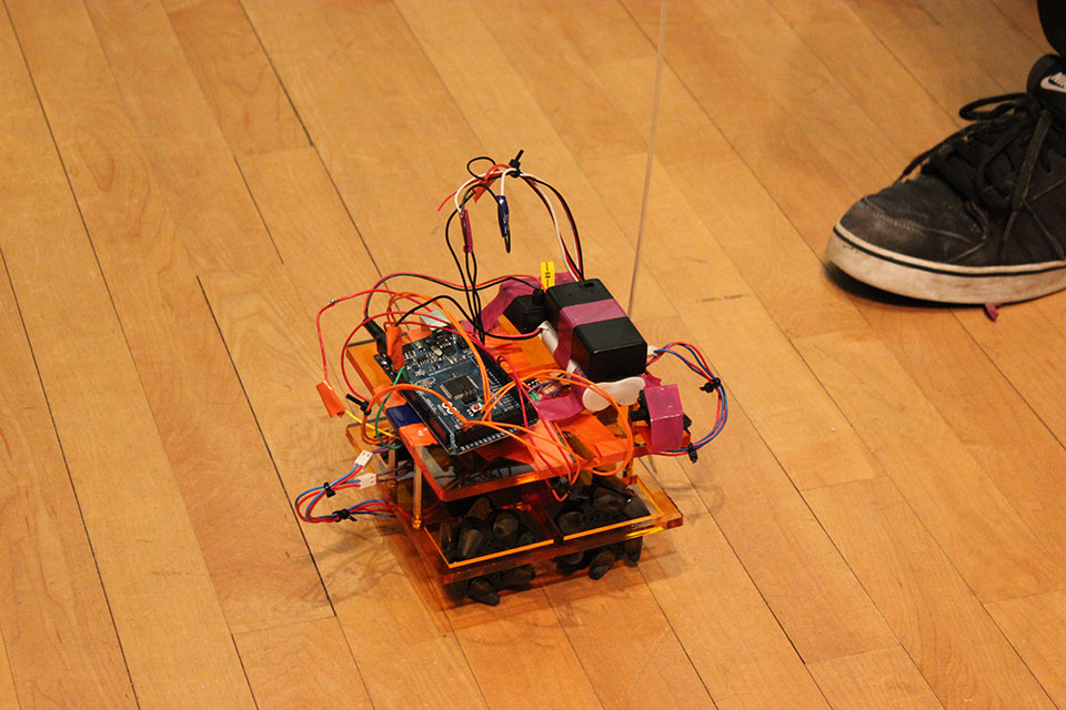 To my surprise (and delight), there were a handful of promising hardware hacks too thanks to HackPrinceton’s approach to reimbursing costs. Drawing Robot, developed by Princeton’s Neil Chatterjee, Joseph Bolling, Ankush Gola, and Pranav Badami, was far and away one of the crowd’s favorites that night. It’s not hard to see why — the four-person team whipped together an Arduino-powered rover about the size of a soccer ball that would slavishly follow a user-defined course.