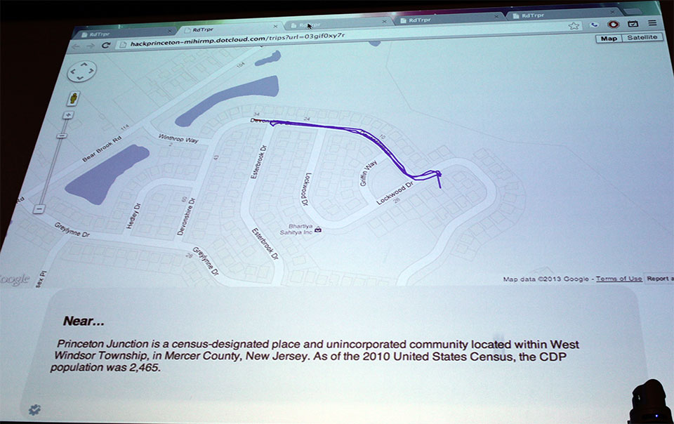 One of the most promising hacks at HackPrinceton was Rd Trpr (pronounced “road tripper”), created by vowel-averse Carnegie Mellon students Siddharth Dhulipalla, William Duff, Atharv Vaish, Mihir Pandya, and Vijay Thurimella. The service is comprised of two parts: an Android application that tracks your location when you head out on road trips, and a web app that displays your location to friends and family once you provide them with a link Rd Trpr automatically generates.