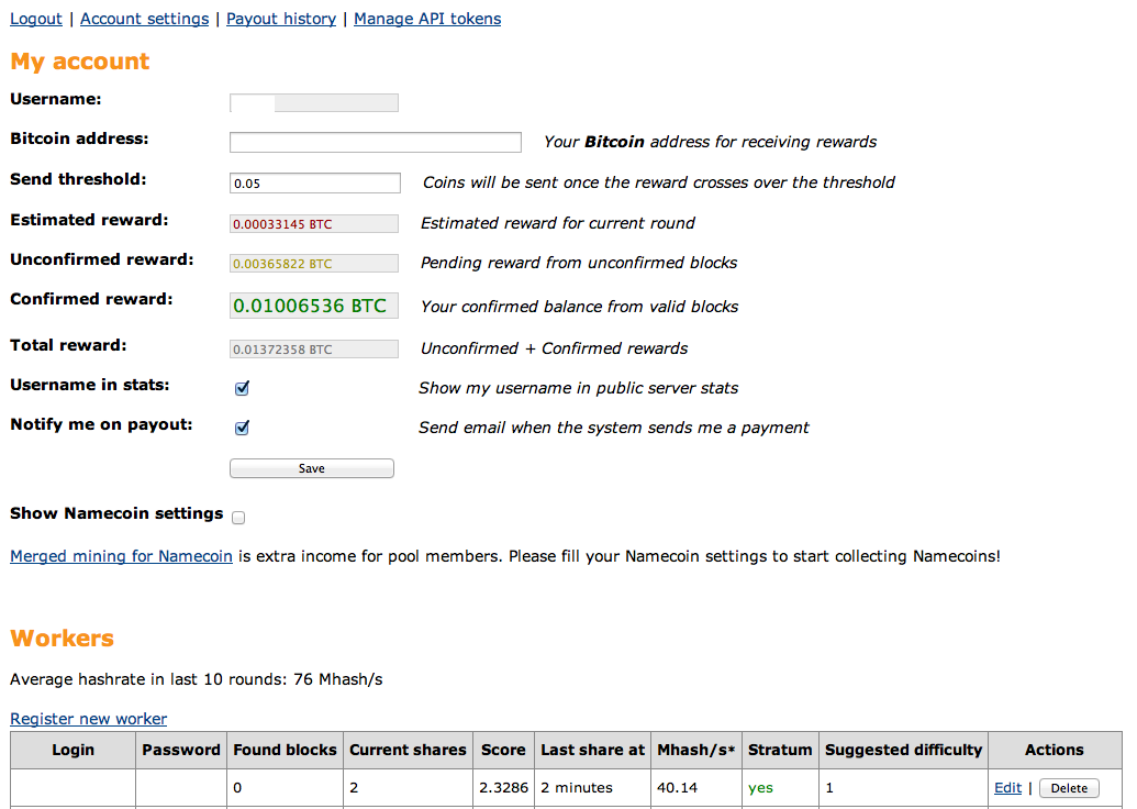 2. Join a pool. To mine in a pool you have to work with a group of other miners on available blocks. The most popular is Slush’s Pool found here. You can also try guilds like BTC Guild as well as a number of other options. Each of the pools is characterized mostly by the fees they charge per block – 2% for Slush’s pool, for example – and the number of users. Pools with fewer users could also have a slower discovery time but pools with many users usually result in smaller payments.