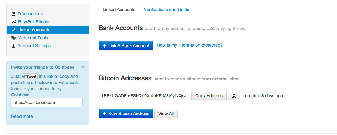 Once you’ve created a wallet, you get an address like this: 1BEkUGADFbrEShQb9Xr4pKPtM8jAyiNQsJ. This, without the period, is a direct way to send bitcoins to your wallet. Make a note of your address. In Coinbase, the wallet address found under linked accounts.