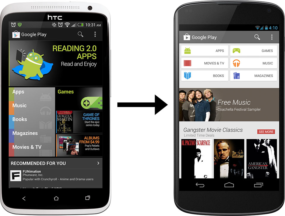 Much like what you’d see in Google Now, individual apps, songs, and books now live in discrete cards, and there’s a much greater focus on big, eye-catching images. Those dreary colors have been given the axe too in favor of a much lighter design that helps make all that content stand out even more. According to Google Play group product manager Michael Siliski, Google has also sought to improve the process of discovering Play Store content by lumping books, tunes, and apps into themed groups. Interestingly, that zeal for a better Play Store experience isn’t limited to the front-end: some 60,000 apps of dubious quality were removed from the Google Play Store back in February, which points to (among other things) a more concerned effort by Google to emphasize quality over sheer Play Store size.