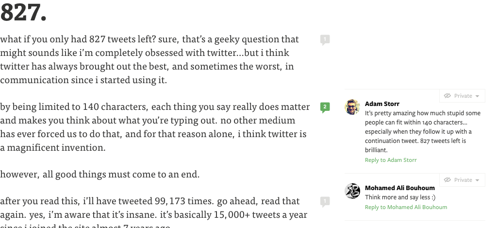 In a way, this is a re-imagination of commenting systems, where instead of a slew of comments showing up below a post, points can be made about particular passages, opening up a new avenue of discussion.