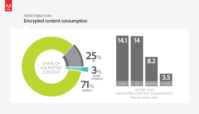 Another area that Adobe monitors is authenticated streams, which it provides publishers through its TV Everywhere service. This allows publishers to gate access to their content to paying subscribers only. Adobe found that 71 percent of this access came from mobile devices, in a reversal of the situation with traditional digital video streams. The Xbox and iOS devices represent the highest engagement for this kind of content, with around 14 plays per unique visitor on both, with Android coming up third with just 8.2 plays per user.